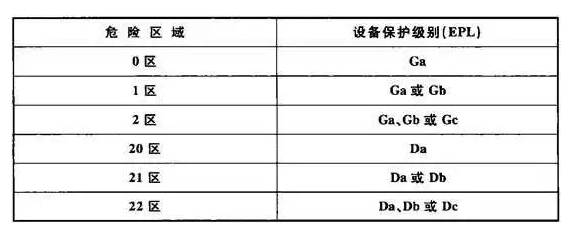 The specific selection of protection levels for electrical equipment in explosive environments is shown in Table 1: