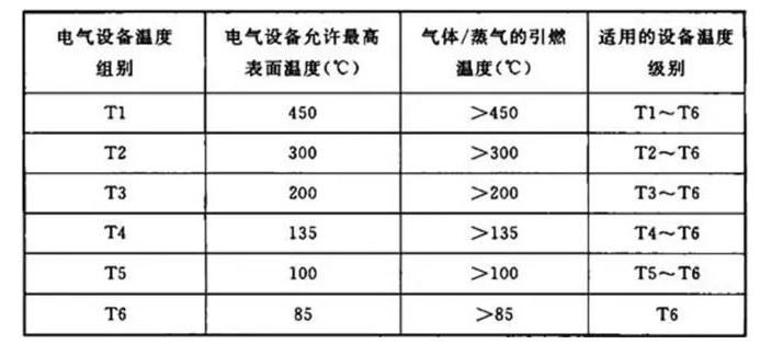 Each explosive gas can be classified according to the maximum test safety gap or minimum ignition current ratio (see Table 2), and grouped according to the ignition temperature (see Table 3). For explosive dust, the classification and grouping are no longer required, but the explosive dust is classified and labeled with the highest surface temperature of the equipment.