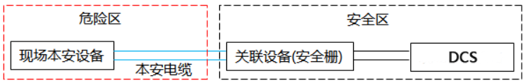 本質(zhì)安 全防爆系統(tǒng)簡稱本安回路系統(tǒng),由三部分組成:現(xiàn)場本安設(shè)備、本安電纜及關(guān)聯(lián)設(shè)備,如圖1所示。系統(tǒng)回路以安 全柵為界分為本質(zhì)安 全電路和非本質(zhì)安 全電路。從安 全柵通過本安電纜連接到現(xiàn)場儀表所構(gòu)成的電路為本安電路;從安 全柵到DCS以及到供電電源的電路為非本安回路。